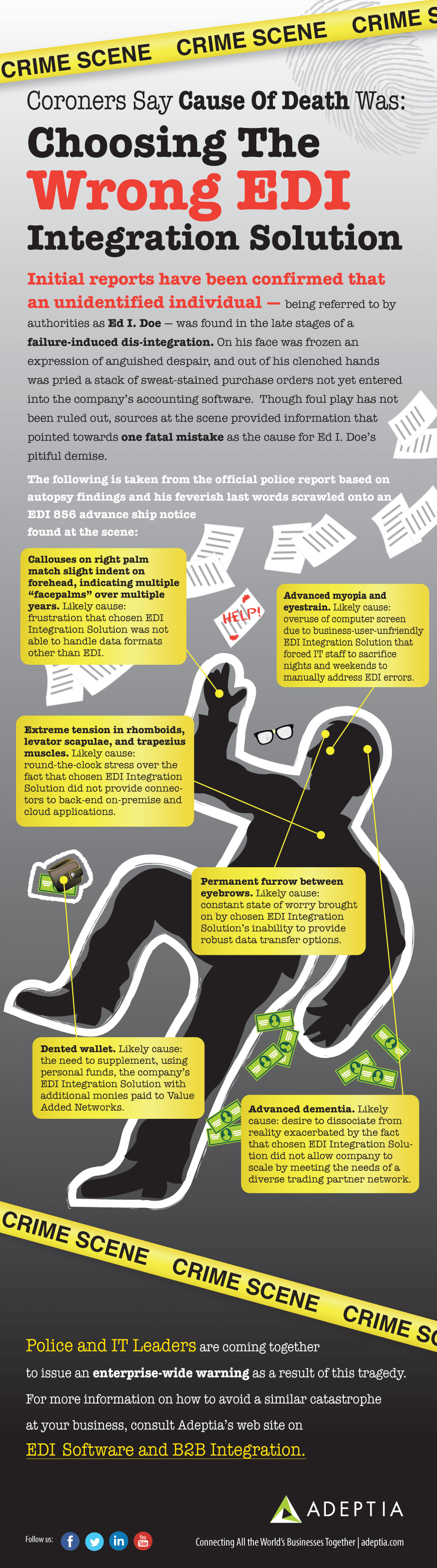 Police tapes, fear in air, and discreet silence amid screaming ambulances just say one thing – somebody ran out of luck. That somebody is ED I. Doe, and he died of failure induced dis-integration. Careful examination of every detail around the pale body shows no signs of struggle but further investigation confirms he succumbed to messy IT and business problems resulting from choosing a wrong EDI integration solution for his business. It all comes together to say – sometimes you want to kill your EDI Integration solution. Sometimes, it kills you.Sometimes you want to kill your EDI Integration solution. Sometimes, it kills you.